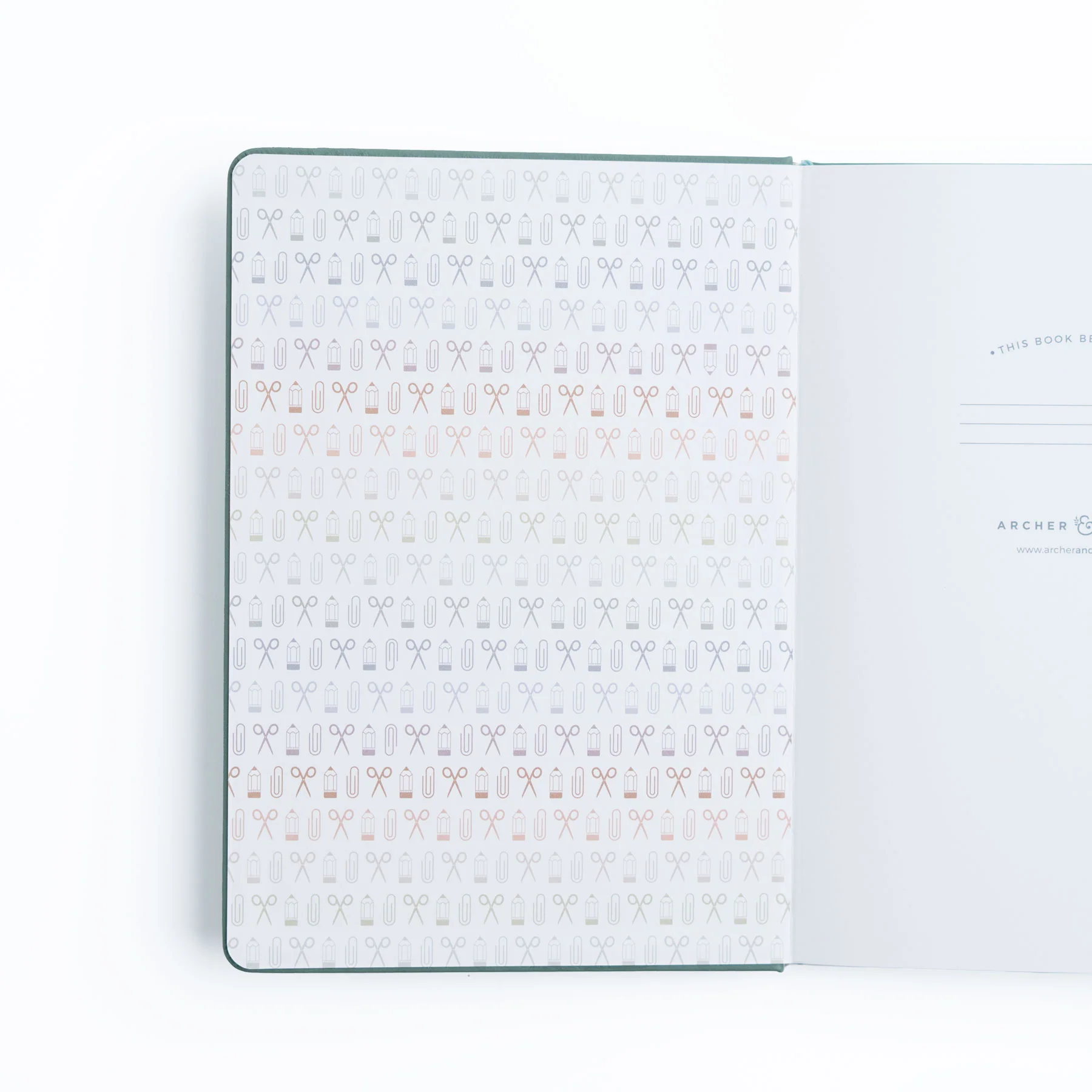 Elegant sage vegan leather cover with minimalist pencil, scissors, and paperclip icons
